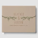 Um livro de convidados de casamento com uma ilustração de galhos verdes na frente. Personalize o texto na frente para incluir nomes e data do casamento. Convites de casamento e outros produtos de coordenação estão disponíveis na Paperie de Jill.