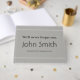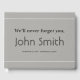 Este guia de simpatia funerária/memorial minimalista mostra a mensagem "Nunca te esqueceremos", e o nome personalizado e as datas de nascimento/morte do indivíduo que passou. Poderia ser usado para registrar condolências aos familiares e amigos de alguém que morreu recentemente.