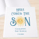 This baby shower guest book features the text "Here Comes The Son" in blue retro typography with a cute yellow watercolor sun.