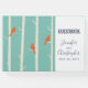 Um livro de convidados de casamento com uma ilustração de pássaros com pássaros laranja sentados em seus galhos. Fundo colorido verde retrô.