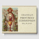 Esta é uma bela imagem vintage de Jesus segurando o Eucarista cercado por querubs e flores. Um cálice de ouro está no primeiro plano.
