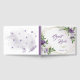lindas flores lilás roxas e brancas com algumas folhas verdes, livro geométrico de convidados dourados.