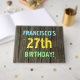 Este design de aniversário divertido apresenta uma mensagem como "27º ANIVERSÁRIO DO FRANCISCO!", onde o nome pode ser personalizado. O fundo apresenta um padrão de aparência rústico, castanho e falso em grãos de madeira. O texto de mensagem personalizável apresenta cores como azul, amarelo e verde, e tem uma aparência inspirada pela de letras pintadas e estêncilhadas. Um livro de hóspedes com tema de vinte e sete anos como este pode ser usado para que os hóspedes de uma festa possam deixar mensagens e saudações. [~Z0000320]