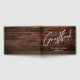 Esta design quente e rústica apresenta uma fonte moderna de escrita manual que foi usada para criar uma letra de leitura gráfica "Guestbook". O fundo estava coberto por uma imagem marrom de madeira. Perfeito para o seu casamento casual ou no celeiro. Use os campos modelo para adicionar seus detalhes pessoais.// 151 //