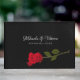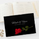 O Livro de Convidados do Casamento Gótico foi projetado para ser elegante e misterioso. É completamente preto e tem um aspecto elegante. A fonte está em uma delicada e quase branca sombra de cinzas que contrasta com o fundo escuro. No fundo há uma rosa vermelha e um pouco de sangue numa pequena piscina, dando ao cartão um toque misterioso e ligeiramente escuro. A rosa simboliza o amor e a paixão enquanto o sangue representa a profundidade das emoções. No geral, o cartão exude um certo drama e intensidade que imediatamente atrai a atenção do receptor. É perfeito para casais que procuram um casamento não convencional e único.