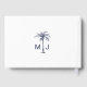 Personalize este livro de convidados de praia tropical com seu próprio toque especial. Este marinho azul e branco moderno apresenta os nomes da noiva e do noivo, as iniciais, a data do casamento e uma palmeira artística.
