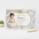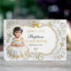 Belo bebê em roupas batizantes. O fundo é uma placa branca com uma estrutura dourada e cintilante prateada e um embelezamento do arco. A parte de trás é enfeitada com fita dourada sobre um fundo branco de cetim.