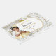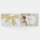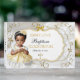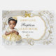 Belo bebê em roupas batizantes. O fundo é uma placa branca com uma estrutura dourada e cintilante prateada e um embelezamento do arco. A parte de trás é enfeitada com fita dourada sobre um fundo branco de cetim.