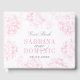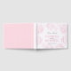 O design do livro convidado de na moda de casamento apresenta um texto personalizado cor-de-rosa e cinza monograma enquadrado por lindas flores de rosa claro. Um padrão de intermitência geométrica aparece no verso.