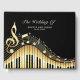Ilustração preta e dourada de um teclado musical com anotações e clave e ouros brilhantes