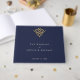 Elegant old money navy blue wedding guest book with faux gold accents and classic serif typography. Editable in the Zazzle editor.