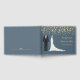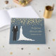 Ouro confetti, smoking e vestido de noiva contra um livro de fundo de cinza azul Guest