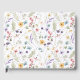 Um padrão floral de aquarela contínuo com delicadas flores silvestres, folhas, borboletas e libélulas em tons pastéis suaves sobre um fundo branco.
