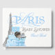 Livro de visitas para chá de bebê em Paris com adorável bebê afro-americano étnico em um fundo azul e prata com presentes e Torre Eiffel. Você pode adicionar o texto de sua escolha na frente e na lombada para personalizar este adorável livro de visitas para chá de bebê masculino em Paris.