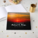 Pássaros no livro convidado da celebração do pôr do sol apresentando uma bela fotografia de pássaros a voar através de um céu nublado nas lindas cores do nascer do sol com vermelhos brilhantes, amarelos do ouro e uma dica de montanhas. Diário fúnebre sem fotos elegantes e um roteiro moderno sobre um fundo com aves no nascer do sol, suas silhuetas escuras contra o céu colorido. Livro convidado do serviço de memorial sunset em texto vermelho e amarelo brilhante e branco contra fundo preto.
