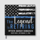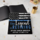 Este design apresenta uma bandeira da polícia com listras pretas e brancas, e uma fina faixa azul de linha também. O texto "A Legenda está se aposentando" fica acima do nome personalizável do polícia oficial aposentado, xerife, capitão ou chefe. Celebre este marco em estilo!