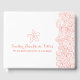 Arte de estrelas da praia / estrela do mar e ondas de espiral deixando o livro de convidados de negócios de férias em coral e ondas brancas contrastantes. Ideal para o leasing ou aluguel de propriedades ou casas de férias pelo mar para obter feedback dos clientes e dar aos seus convidados um livro interessante para serem vistos. Personalize com o nome da sua empresa e a mensagem do livro de hóspedes neste design do livro de hóspedes estilo praia. Perfeito para alugar empresas de férias e casas costeiras ou costeiras. Lê-se que Seastar Beachside Villas, o nosso convidado nos deixa uma mensagem. © Original design e trabalho de arte por Sarah Trett. www.sarahtrett.com para www.mylittleedenweddings.com