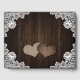 Elegant rustic purple and blue floral wedding guest book featuring two floral hearts, white floral lace and string lights on a rustic wood background. Two burlap hearts with elegant floral lace against a barn wood background at the back.