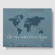 Que a aventura comece o design de texto com a decoração do mapa mundial sobre fundo azul e verde