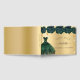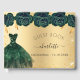 Para uma Quinceañera, 15 festa de aniversário. Um fundo ouro com brilho de ouro falso, um vestido verde e rosas verdes, florais. O nome é escrito com um moderno estilo escrito à mão. Personalize e adicione um nome e data. Spine: adicione seu texto.