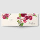 Um floral brilhante e ousado de rosas em tons de burgundy e creme é o ponto focal de muitas das peças deste suite de casamento que também contém textos elegantes e layouts modernos de design. O livro de hóspedes personalizado mostrado aqui permite que você edite facilmente os nomes da noiva e do noivo e a data do casamento usando o modelo fornecido. Procure ID584 para ver todas as peças correspondentes neste belo conjunto de casamento.