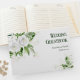 Um livro de convidados de casamento simples e elegante, com rosas brancas de aquarela e flores de hálito de bebê em um fundo branco.