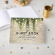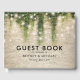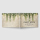 Livro de convidados de casamento de conto de fadas mágico, com um fundo de muro de pedra rústico, videira verde com luzes cintilantes e uma modelo de casamento moderna.