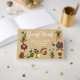 This whimsical baby shower guest book cover is adorned with a charming, nature-inspired illustration. Playful mushroom characters, dressed in bright red caps, hold fruits and vegetables while surrounded by buzzing bees, a butterfly, carrots, a beet, a basket of berries, olives, lemons, and delicate flowers. The artwork creates a joyful garden scene that feels both festive and storybook-like.