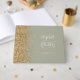 Este elegante livro de hóspedes do casamento apresenta uma borda esquerda de falsa brilho dourado num fundo verde sage. Personalize facilmente o texto de marfim com os nomes do casal na caligrafia de escrita manual em um grande e grande texto. Adicione texto adicional da sua escolha à frente e à coluna.