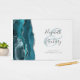 Este elegante livro de hóspedes apresenta uma cor azul-lacrimogênea agata design aparada com falso brilho prateado. Personalize facilmente o texto das cinzas de carvão em fundo branco, com os nomes da noiva e do noivo em caligrafia caprichosa sobre uma grande e grande mala. Adicione texto adicional da sua escolha à frente e à coluna.