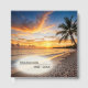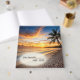 Uma cena de praia serena apresenta um pôr do sol espantoso, com matizes laranja e azuis vibrantes pintando o céu como ondas suaves beijam a costa arenosa para um funeral ou funeral. Todo o texto pode ser alterado.