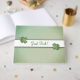Livreto de trevo verde e ombre. Adicione o nome do evento e a data na lombada.