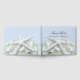 Livro de hóspedes de praia com estrelas brancas e flor de hydrangea. Personalize com nomes e data de casamento sobre um fundo azul claro. Combina produtos na linha de design do Jardim Costeiro.