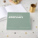 Este na moda, moderno livro de hóspedes, com tipografia ousada e um fundo verde sábio constituiria uma maravilhosa adição para a sua celebração de casamento. Adicione facilmente suas próprias informações clicando na opção "personalizar".