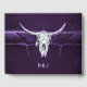 Este livro de hóspedes do casamento ocidental apresenta um crânio de vaca touro com uma design de fundo rústica branca púrpura e escura. Vintage farm inspirou, antiga antiguidade no estilo oeste selvagem. Legal, moderno, animal fazenda. Imagem copyright Marg Seregelyi Fotografia.