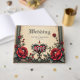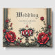 Um romance gótico. Um quadro em estilo gótico e ornamentado ao redor de um fundo bege. As rosas vermelhas com folhas verdes escuras são dispostas ao redor do quadro, principalmente nos cantos. No centro inferior, há um emblema decorativo em forma de coração com a palavra "LOVE" inscrita em uma fonte estilizada.