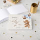 Adicione um toque pessoal à celebração do seu chá de fraldas com estes itens de na moda e festa memoráveis! Design apresenta um ursinho de pelúcia com balões azuis sobre fundo bege.