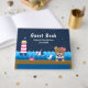 Este bonito e divertido livro de hóspedes apresenta um urso marinheiro náutico num convés de madeira com uma gaivota e um caranguejo. Ao fundo há um farol rosa e branco, um pássaro giro em um veleiro, ondas oceânicas e um marinho azul estrelado céu noturno. O texto combina fontes em negrito e sem serifa para uma aparência na moda e moderna. Isto é perfeito para um chá de fraldas temático náutico.