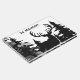 Veado emerge de pinheiros e é cercado por flores silvestres em design simples da vida selvagem.
