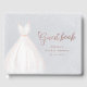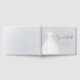 Livro de visitas de festa de noivado elegante com vestido de noiva aquarela branca com brilho falso rosa dourado glitter em fundo azul empoeirado.