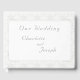 Design apresenta um plano de fundo maravilhoso da imagem de um local branco-vintage no cobrir frontal, coluna e cobrir traseiro. O texto é exibido em uma fonte Nupcial elegante e de cor prateada. Todo texto é personalizável e projetado para coordenar com a Vintage White Lace Católica Wedding Suite. Também disponível em branco puro.