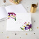 Este livro de convidados romântico apresenta um design floral. O fundo é um branco simples e elegante com violetas de aquarela roxas. Um delicado buquê de flores violetas é uma figura no canto superior esquerdo, com os nomes do casal impresso abaixo.
