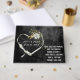 White rose bouquet with white ribbon heart and gold rings on a black leather textured background.