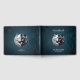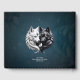 Yin Yang Wolves. A imagem mostra um lobo branco e um lobo negro, suas cabeças encarando-se umas às outras em um tiro de perto. O lobo branco tem olhos azuis e um ornamento ouro com uma joia azul na testa, enquanto o lobo negro tem olhos amarelos e ornamento semelhante. Os lobos estão posicionados contra um fundo azul escuro com um símbolo yin yang branco entre eles.