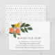 Um cartão de pedido de livro para chá de bebê. Com frutas cítricas de laranjas e limões em um ramo de folhagem e poema: "UM PEQUENO PEDIDO, ESPERAMOS QUE NÃO SEJA DIFÍCIL