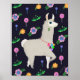 Uma lhama fofa, enfiada num colar de fios vibrante, coloca-se contra um fundo de onyx profundo adornado com um padrão de flores vivas em tons de laranja, rosa, azul e verde. Arte original de Noël Snow.