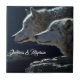 Um par de lobos cinzentos sob uma Lua cheia olha fora na noite. Um design bonito para um casal.