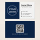 Cartões de visitas modernos, brancos e azuis escuros com modelo de logotipo personalizado e cude QR no verso. Design moderno e mínimo. Fontes, cores de fonte e cores de fundo podem ser alteradas com a ferramenta de personalização.