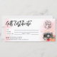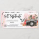 Logotipo do certificado de presente de fotógrafo de ouro floral com uma câmera de aquarela pintada manualmente e buquê de aquarela floral em uma pincelada de aquarela rosa com falso confete de brilho dourado.