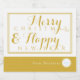 Um design elegante para uso profissional ou por outros grupos para ofertas na época de férias. Este modelo tem um logotipo e texto para você editar e substituir por seu próprio logotipo e nome ou mensagem da empresa. O cartões de natal diz, "Feliz Natal e Feliz ano novo" em roteiro. A peça é de um elegante ouro e cor branca.